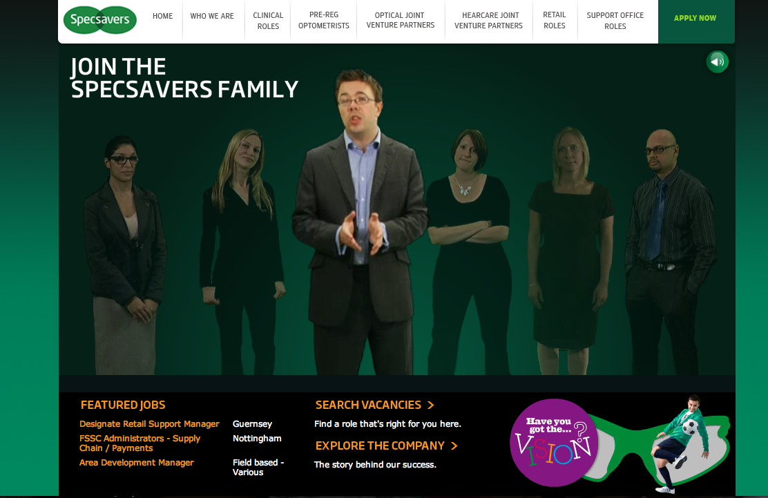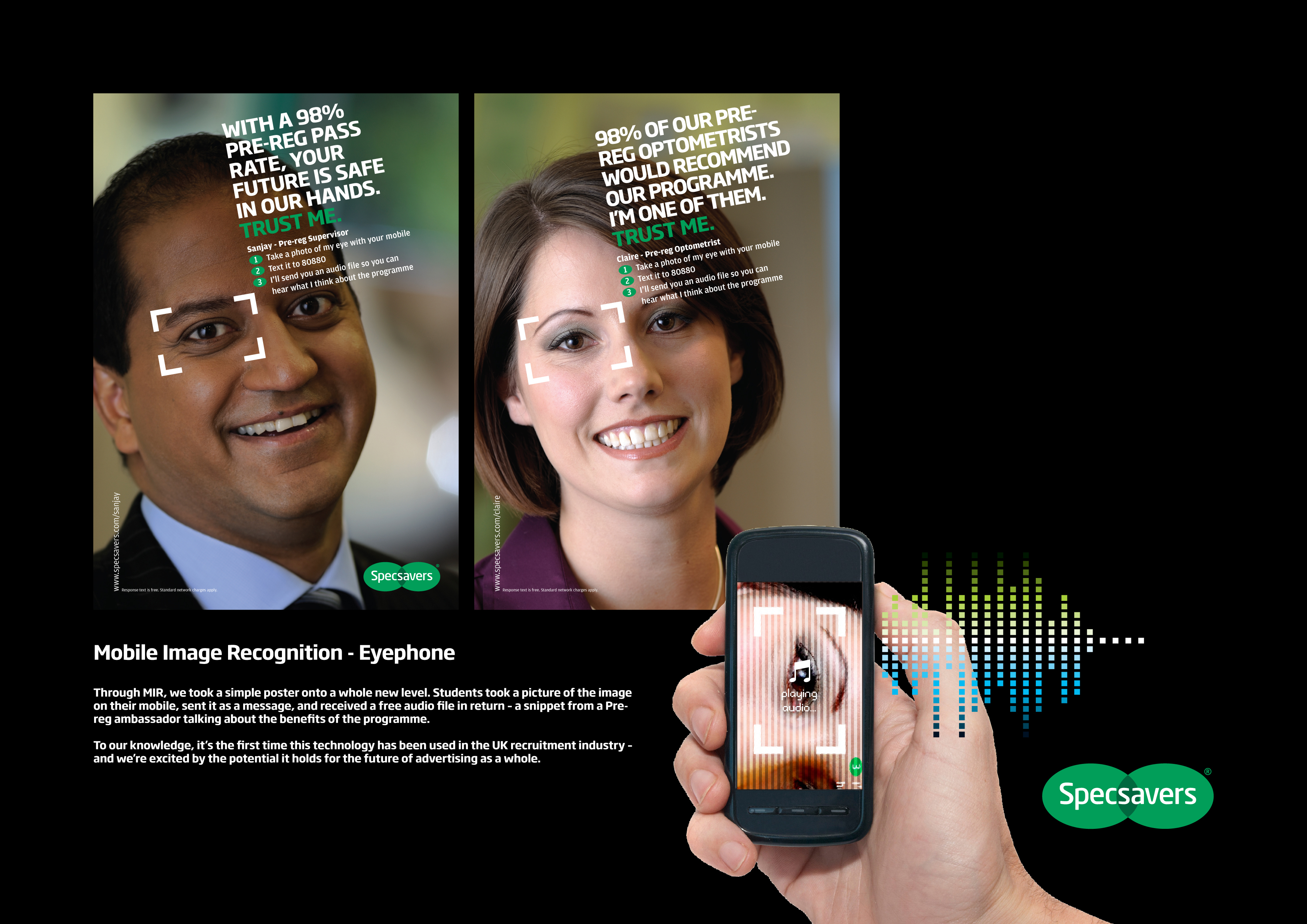 Always keen to think creatively in every sense, I was also one of the brains behind an integrated on-campus campaign for Specsavers that enabled students to take an image of a person in a poster on their mobile phone. They then received an audio file of that person talking about why they should join their pre-reg scheme. A first for recruitment at the time.